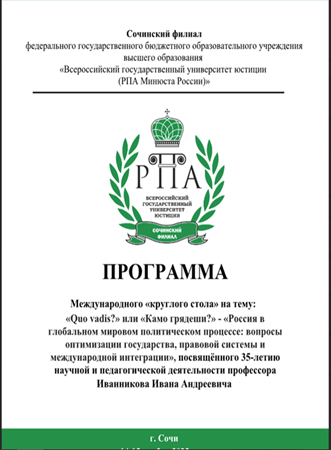 14–15 ноября 2025 года в Сочинском филиале Всероссийского государственного университета юстиции (РПА Минюста России) состоялся международный круглый стол «Quo vadis?» – «Россия в глобальном мировом политическом процессе: вопросы оптимизации государства, правовой системы и международной интеграции», посвящённый 35-летию научной и педагогической деятельности профессора Ивана Андреевича Иванникова.